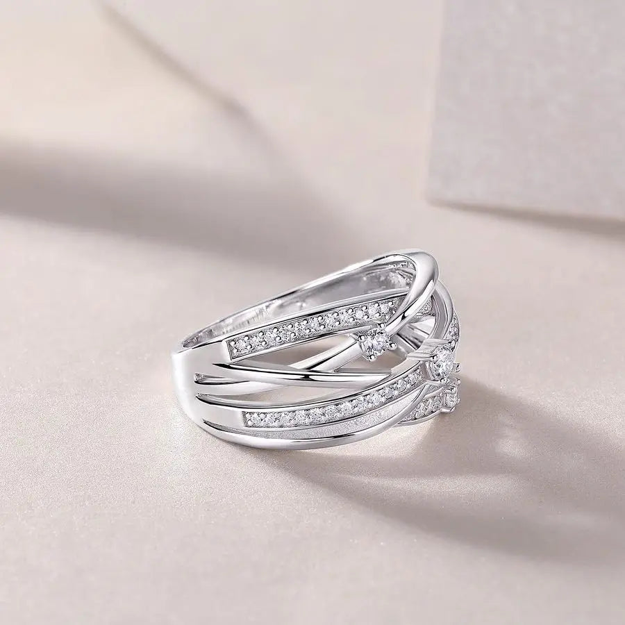 0.345cttw Multi-Layered Moissanite Criss-Cross Ring - S925 Sterling Silver Statement Ring with Sparkling Stones