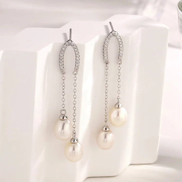925 sterling silver cubic zirconia diamond freshwater pearl long drop dangle earings