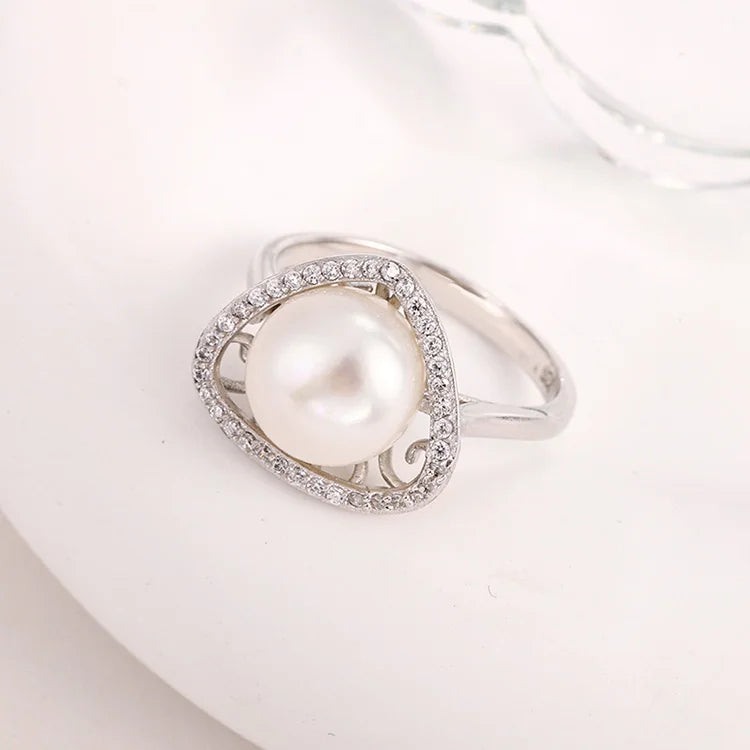 Cubic zirconia diamond setting round triangle dainty 925 sterling silver freshwater pearl ring for women