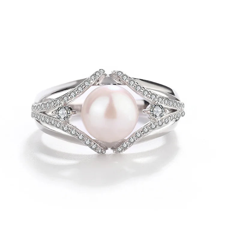 Custom women engagement wedding sterling silver freshwater pearl ring with zircon moissanite