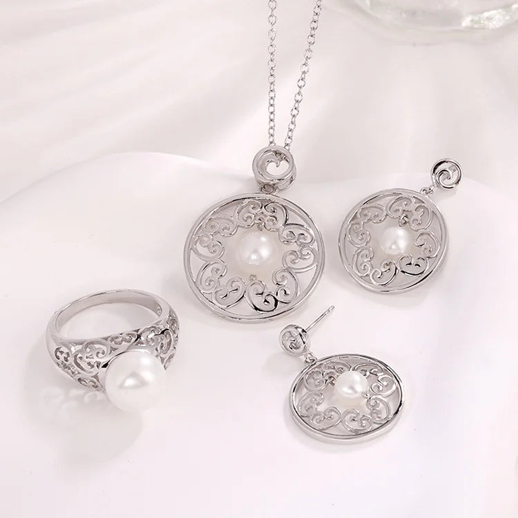 Fashion women jewelry dainty ring 925 sterling silver fresh water pearls pendant necklace and earrings set