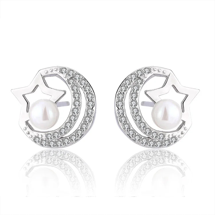 Women luxury fine jewelry gift 925 silver ring moon star pearl pendant necklace earrings set